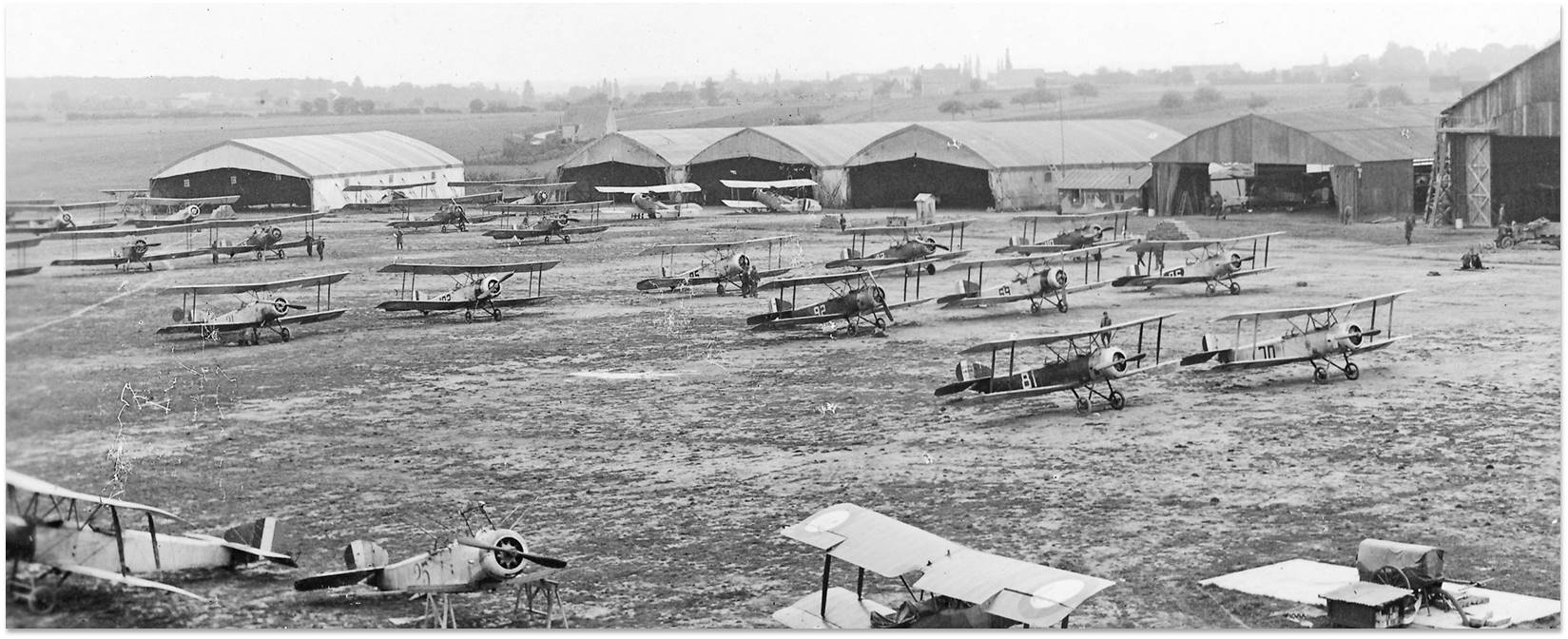 Cette vue de l’extrémité sud du terrain prise depuis le haut du hangar n°6, permet de voir les Sopwith 1A français mis à la disposition de l’école américaine. En 1919, l’armée française récupère le camp d’aviation et installe le 31er régiment aérien d'observation. En 1922, l’Aviation Club de Touraine est créé sur le camp d’aviation de Parçay-Meslay